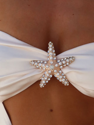 Crafted from satin fabrication, she features an off-shoulder neckline, sculpted bodice, and an asymmetric waist cut-out that flatters the figure. Crystal-encrusted starfish embellishments accent the bust and hip, while the open back is finished with a gold clasp closure.