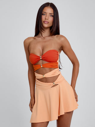 Crafted from soft jersey and lined in polyknit, she hugs the body with a smooth, sculpted fit and moderate stretch. Designed with a strapless bandeau-style bust and statement centre front gold hardware, Ariella brings bold contrast through her layered colour-blocked design. Finished with an asymmetrical mini skirt and easy pull-on fit, she’s made for euro summer nights and vacation plans.