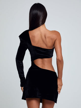 Crafted from luxe velvet, she features an asymmetric silhouette with a single long sleeve, structured shoulder pad, and daring cut-out waist. The sheer mesh bust is delicately adorned with diamanté embellishments, adding a touch of sparkle, while the detachable centre brooch allows for a custom finish.