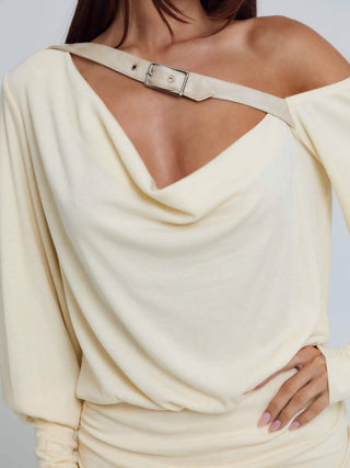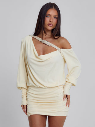 Crafted from high-stretch rib and lined in poly-knit, Azari is designed with an oversized draped top and a fitted mini skirt for the perfect balance of relaxed and sculpted. Featuring an off-shoulder neckline and adjustable front buckle detail, she’s easy to wear while still feeling elevated.