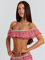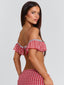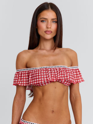 Meet our Betty Top in Red Gingham, a playful summer piece with a feminine, off-shoulder silhouette. Crafted from lightweight mesh, she features a frill neckline that sits softly across the shoulders, finished with delicate contrast lace trim. Designed with internal grip tape and a back clasp for a secure fit, she offers both comfort and support. Perfect for beach days, vacations, or summer plans.