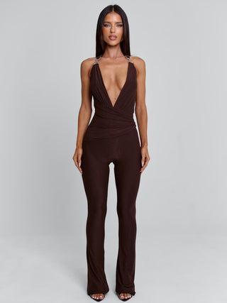 Get ready to turn heads in the show-stopping 'Carys Jumpsuit' in Chocolate!