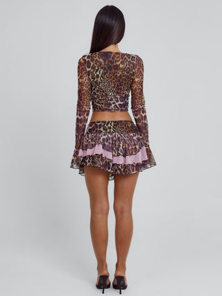 Crafted from mesh fabrication, she’s designed in a flattering cropped silhouette that contours the body and is lined in mesh that creates a flattering fit. Ciela features long sleeves finished with delicate frill hems, balanced by a plunging neckline with a true tie at the front bust. A soft contrast frill along the inner bust edge adds a feminine touch, while the exclusive Outcast print gives her that statement, going-out energy.