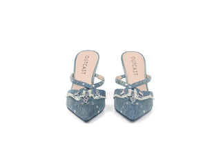 Capturing the elegance of a classic mule with a touch of edge! Cindy is crafted from denim, featuring a 9.5cm stiletto heel. She is designed with a scooped upper with strapping details to create a flattering silhouette. Cindy has a perfectly pointed-toe shape with frayed edges. This stiletto is complete with silver stud detailing and a custom Outcast hardware charm to add further intricacy to the heel.