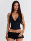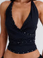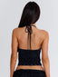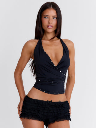 Obsessed with our Elliana Top in Black! She features an overlapping plunge neckline with a halter neck tie for a flattering fit. The wide underbust panel is finished with subtle silver stud detailing, adding an elevated edge. Perfect for festivals, parties, or a night out.