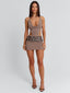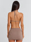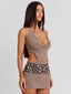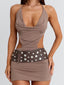 Meet our Elly Mini Dress in Brown, a flattering silhouette designed with a soft, feminine drape. Crafted from stretch jersey, she features a cowl neckline that falls effortlessly over the body, balanced by halter neck ties and an adjustable back strap for a custom fit. The waist cut outs and statement PU belt with hardware detailing define the shape, creating a contoured, sculpted look. Perfect for parties, festivals and nights out with your girls!