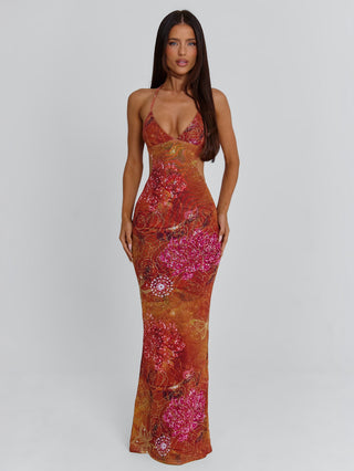 Crafted from a lightweight mesh fabrication, Esmeralda features a stunning print in sunset hues that ensure all eyes are on you. Designed with a bodycon silhouette, the maxi length gracefully elongates your figure, while the halter triangle neckline and contoured side bodice cut-outs add an alluring edge. The adjustable neck and back ties ensure the perfect fit, and the backless design delivers an irresistible statement from every angle.