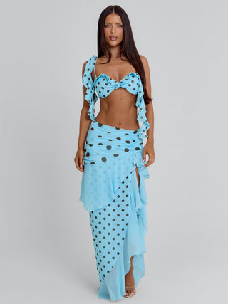 Crafted from a lightweight georgette fabrication, she features a soft blue base with contrasting polka dots for a playful yet elevated finish. Designed with adjustable shoulder straps and a true tie at the back bust, she offers a customisable fit that flatters and shapes. Delicate frill detailing and a flounce hem add movement and dimension, while her cropped silhouette keeps the look modern and feminine.
