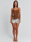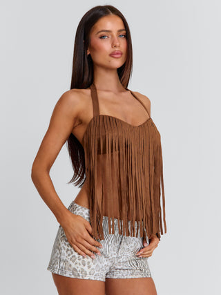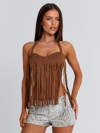 Obsessed with our Francine Top in Brown, a statement piece designed with a soft, textured finish. Crafted from faux suede, she features fringe detailing across the bust that adds movement and a relaxed, elevated feel. The halter neckline frames the shoulders, while a back clasp ensures a secure fit. Perfect for festivals and western styling.