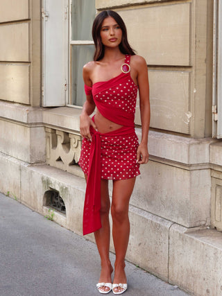 Playful yet refined, our Imara Mini Dress in Red Polka Dot is designed to make a statement.