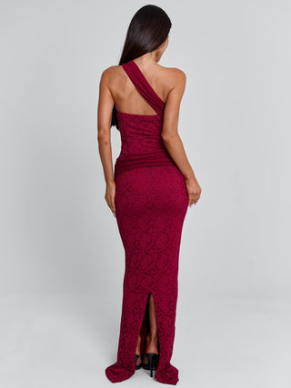 Crafted from a lace fabrication and fully lined, Irma features contrast jersey panelling that enhances the figure. The design is finished with a fixed waist tie that drapes elegantly, creating a flattering silhouette. With its one-shoulder neckline and floor-skimming length, this dress is the epitome of effortless sophistication!