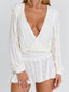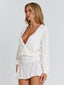 Crafted from delicate lace with high stretch, she features a wrap-style bodice with a softly billowed bust and a flattering V neckline. The waistline defines the silhouette before falling into a floaty A-line mini skirt, creating an effortless balance of softness and shape. Finished with long sleeves and cuff detailing, Izzy is designed for feminine, elevated occasions.