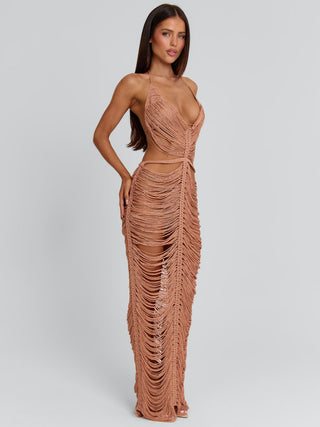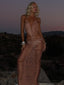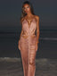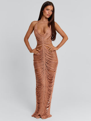 Obsessing over our Kaelani Maxi Dress in Rose Gold, a statement silhouette designed to highlight the body.