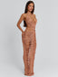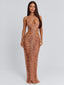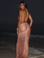 Crafted from crochet with metallic yarn, she drapes effortlessly with a plunging neckline and halter design. The ruched crochet detailing through the bust and skirt contours the figure, while the open back and flowing maxi length create an elevated finish.