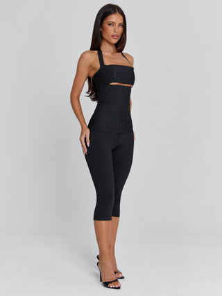 The Karne Capri Jumpsuit features a supportive bandage bodice designed to cinch and shape, paired with a halter neckline and a subtle under-bust cut-out that draws the eye. The stretchy jersey capri pants balance comfort with a body-hugging fit, while a button closure at the back of the neck and back zip ensure a secure finish.