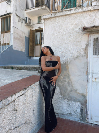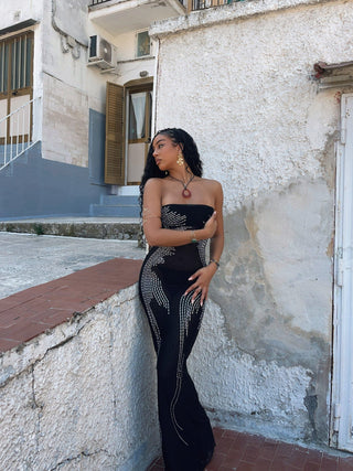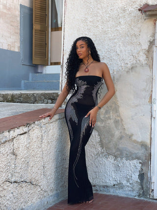 Crafted from a sheer mesh fabrication, Kathie features silver embellishments throughout that are strategically places to enhance your silhouette, with her body-con fit. She is designed with a strapless neckline that showcases your décolletage, whilst draping to a maxi length.
