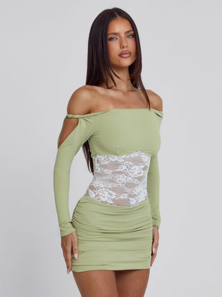 Crafted from soft jersey and lined in polyknit for an opaque feel through the bust and skirt, Lexa features a sheer lace bodice panel that adds texture and dimension. Designed to sit off the shoulders, she’s finished with twist detailing through the sleeves, a subtle keyhole cut out at the neckline, and a gathered mini skirt for a flattering bodycon fit. Perfect for parties and going out nights.