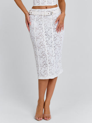 Crafted from sheer lace, this skirt features a flattering, body-skimming silhouette with a PU belt detail at the waist for a subtle contrast. Finished with a concealed side zip for a smooth fit.