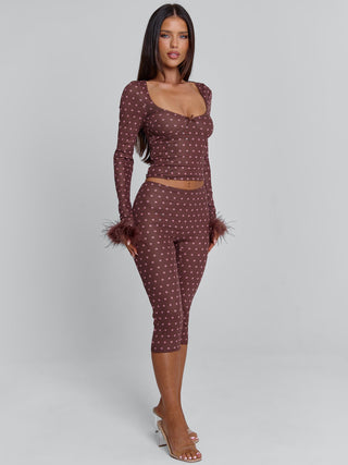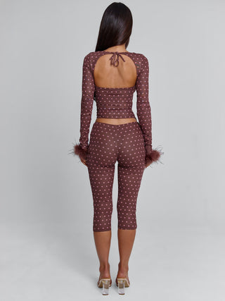The Mahria Pant in Brown Polka Dot is a sleek, sculpting capri designed to pair back with the matching top.