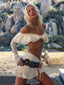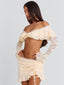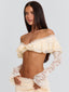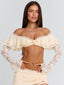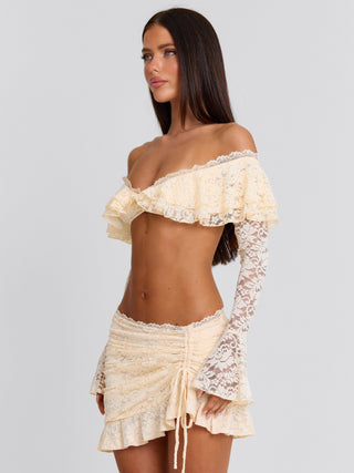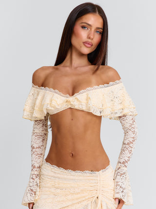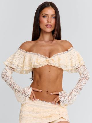 Meet our Marcella Top in Cream, a soft, feminine piece designed with delicate texture and shape. Crafted from lace, she features an off the shoulder neckline with layered frill detailing across the bust. The long sleeves are finished with a subtle flare, while scallop lace trim adds a refined finish. Designed with a back clasp for a secure fit, she’s perfect for vacation styling, festivals and summer days!