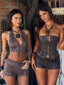 Meet our Mason Shorts in Brown, a statement mini short designed with bold hardware detailing. Crafted from soft faux suede and lined in poly-knit, she features a structured waist belt with a silver buckle and lace-up detailing along the sides for an edgy finish. Silver eyelets enhance the design while maintaining a sleek festival-ready look.