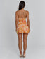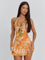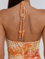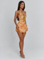 The Calilie print features bright hues of oranges, yellows, and white. Crafted from printed slinky fabric, this mini dress features a sequin front detail and bead accents at the neckline. The flouncy drawstring skirt adds playful movement, while the halter neck with a true tie ensures a customisable fit.