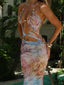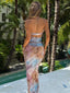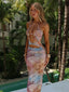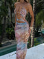 The Nikila Maxi Dress in Lagrono Ocean is cut from printed mesh and fully lined for a body-hugging fit. It features a halter neckline with silver chain and blush bead detailing on the straps, a plunge bust cut-out, and a small asymmetric cut-out at the midsection. The skirt sits low on the hips and falls to a straight maxi hem.