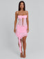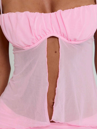 Meet our Noella Top in Baby Pink, a feminine statement piece designed to sculpt and flatter. Crafted from sheer mesh, she features a structured ‘W’ underwire bust that enhances the silhouette, while soft draping across the bodice adds a romantic, elevated finish. Designed with adjustable straps and a secure back clasp, she offers both support and versatility. Perfect for styling with her matching skirt or your favourite low-rise bottoms.