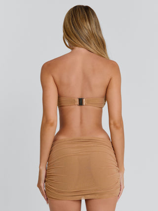 The Oraya Mini Dress in Tan is crafted from power mesh and fully lined for a smooth, sculpting fit. Designed with boning through the front bodice, it shapes and supports while defining the waist. Embroidered appliqué across the bust is finished with a satin bow detail, adding softness to the structured silhouette. The gathered mini skirt hugs the hips and creates a flattering finish. Complete with a back bust clasp closure for a secure fit.