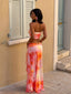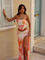 Cut low on the waist with a thigh-high split and soft flounce, it’s made for golden hours and late nights. The dreamy mix of pale pinks, oranges, and yellows gives it that sunkissed, summer feel.