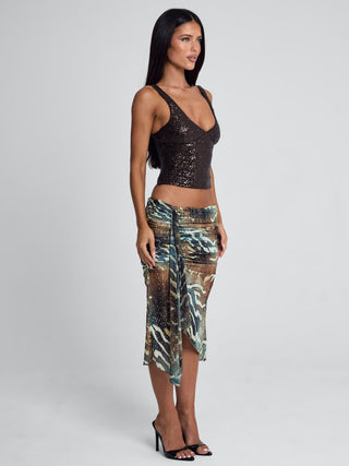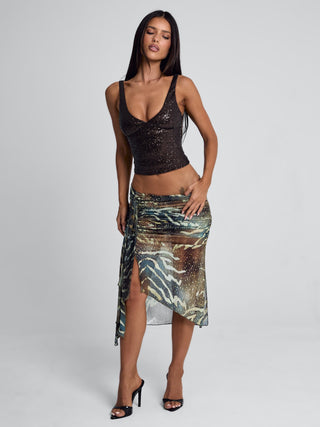 Crafted from soft printed mesh, she features gathered detailing at the side and a cascading flounce hem that drapes beautifully against the body. The earthy tones of the Mojave print make her the perfect piece to style with our Roei Corset Top for a coordinated look.