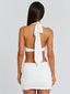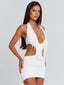 Meet our Romanee Mini Dress in White, a sleek silhouette designed to contour the body. Crafted from stretch jersey, she features a plunging neckline with soft fringing at the bust for added movement. The halter neck tie and back clasp provide a secure, adjustable fit, while the fitted skirt with subtle gathering enhances the shape. Perfect for parties, bachelorettes, or nights out.