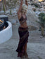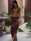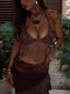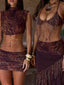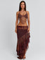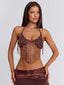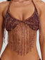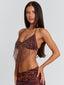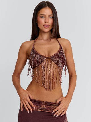 Meet our Rosailina Top in Rayella, a statement bralette designed with intricate detailing. Crafted from printed stretch mesh and lined in poly-knit, she features a halter neckline finished with a braided fabric trim. Beaded fringe cascades from the bust, adding texture and movement, while adjustable ties at the back and side allow for a customised fit.