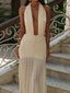 Crafted from soft, gathered mesh, the Rosii Maxi Dress features a deep plunge halter neckline, a fitted ruched skirt that enhances your shape, and an open back with adjustable ties for a custom fit. Fully lined through the bust and upper skirt, the lower hem falls sheer highlighting your legs.