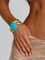 Meet our Rune Bangle in Gold, a bold yet effortless statement. She features a polished gold-tone cuff with a striking oval turquoise stone at the centre, bringing a vibrant pop of colour to your look. Designed with sculptural open detailing at the sides and a hinged closure for easy wear, she’s the perfect piece to elevate both festival styling and evening outfits.