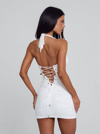 Crafted from our signature lace mesh fabrication, this flattering mini showcases all of your best assets. Featuring a low-cut neckline, lined mesh and an adjustable halter necktie feature! Completed with PU strap detailing at the waist with eyelet hardware, along with an open lattice, criss-cross back.