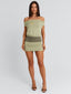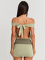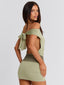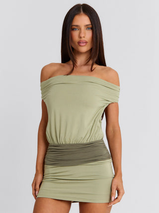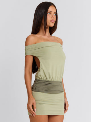 Meet our Shilou Mini Dress in Sage, a soft and flattering silhouette designed for effortless styling. Crafted from slub jersey, she features an off-shoulder neckline that highlights the décolletage, balanced by a fitted bodycon shape that contours the figure. A contrast waistband panel defines the waist, while the adjustable tie-back detail adds a feminine finish. Perfect for date nights, parties, or elevated everyday moments.