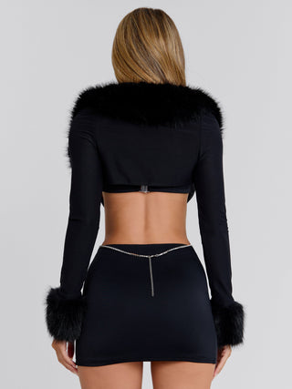 Crafted from a smooth, fully lined jersey fabrication, this halter-style mini features a plunging neckline and adjustable ties for a secure, flattering fit. Diamante silver hardware and delicate chain detailing define the waist against the sleek, black silhouette. Finished with a back bra-style clasp closure, this dress is fitted, sculpted, and made for nights out.