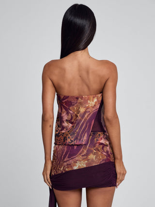 Crafted from printed mesh, this mini features a billowed bodice that flows into a sculpted, body-con skirt. The sheer side cut-out adds a touch of edge, while the contrast mesh tie detail at the hem brings playful texture and movement. Finished with an invisible zip closure, she’s designed to flatter your figure from every angle.