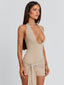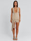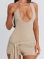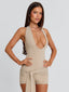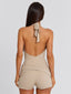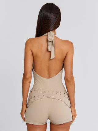 Meet our Traci Playsuit in Stone, a flattering silhouette designed to contour the body. Crafted from stretch jersey, she features a deep V neckline with a halter neck tie for an adjustable fit. The overlay hip panels with a front tie add subtle detail, while silver hardware studs give a refined edge. Perfect for festivals and summer plans.