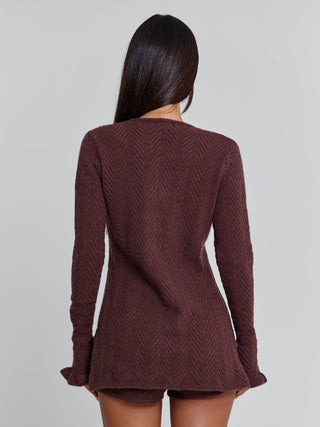 Crafted from a true knit with a beautiful herringbone texture, she features a deep neckline and a sculptural gold clasp that draws the waist in while keeping the silhouette effortless. Long sleeves with a gentle frill finish add a touch of softness to the overall look.
