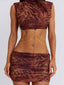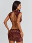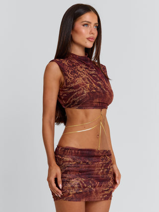 Meet our Zaria Mini Dress in Rayella, a striking silhouette designed to contour the body. Crafted from stretch mesh, she features a high neckline and fitted mini shape with an open back for a bold finish. Detachable gold snake chains wrap around the waist to accentuate the silhouette, adding a statement detail that elevates the look.