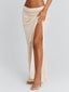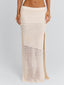 Crafted from true knit crochet, she features a flattering body-skimming silhouette with a statement front split for added movement. Designed with scattered pearl bead detailing and overlay panels at the hips, she creates texture and dimension while maintaining a sleek finish.